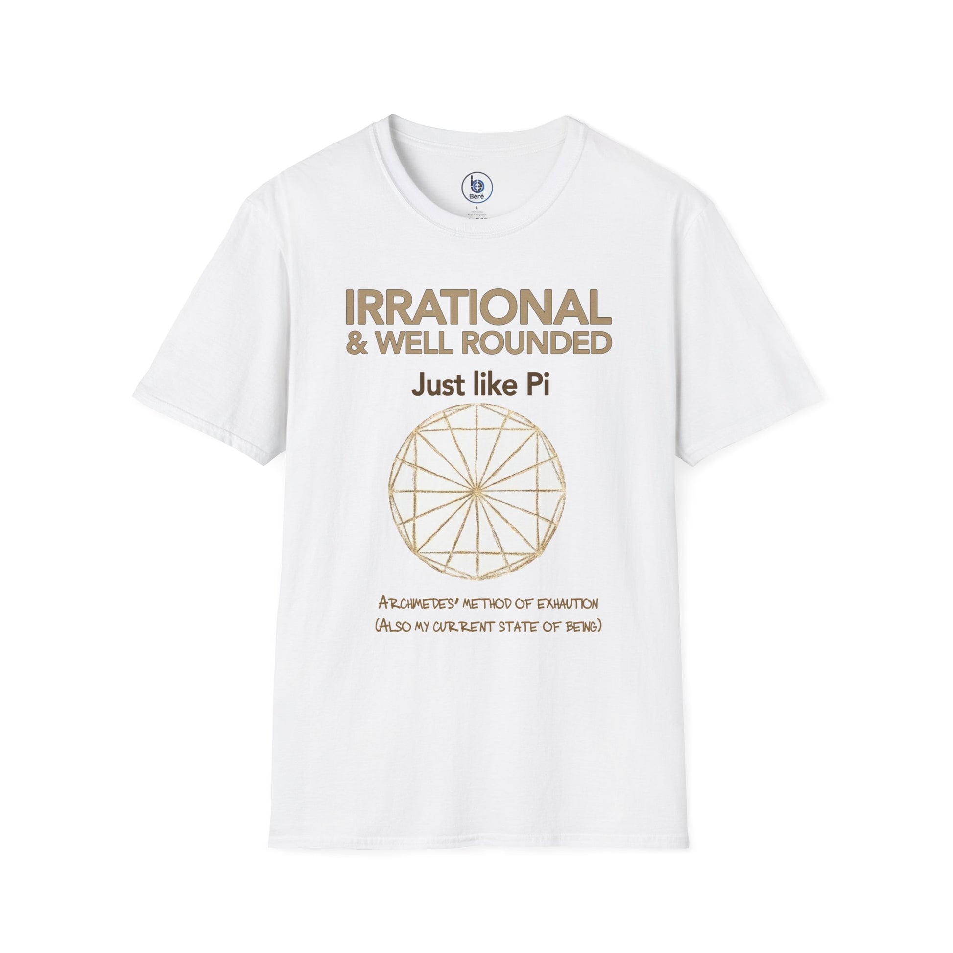 Soft, breathable tee that pairs quiet wit with mathematical charm. The clean white canvas showcases a gold-accented circular graphic and the headline “Irrational & Well Rounded — Just like Pi,” giving the shirt a smart, playful personality without shouting. Lightweight ring-spun cotton feels smooth against skin and drapes cleanly in a classic crew silhouette. Subtle details — a ribbed collar that keeps its shape, shoulder tape for stability, and a tear-away label — make everyday wear more comfortable. This shirt slips easily into a casual lecture, a study group, or a cozy night in with friends who love a clever pun and a touch of geeky style.